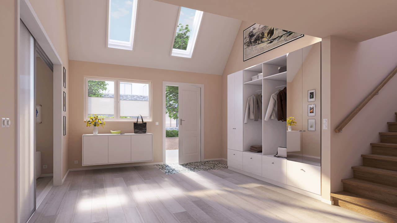 Dankzij de individuele onlineconfiguratie past de diepe kast met laden, deuren en spiegel millimeter nauwkeurig in het ingangsbereik.