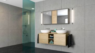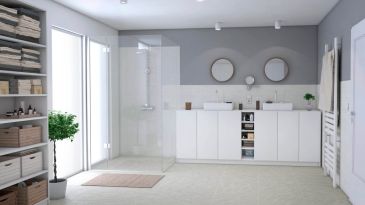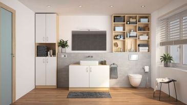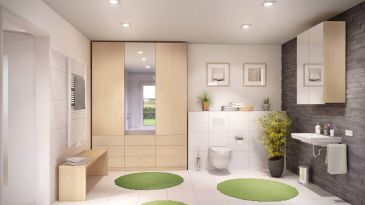 De drie open kasten in de nis maken een slim gebruik van de opbergruimte in de badkamer mogelijk. Wasmachine en droger kunnen perfect in het open kastsysteem worden geïntegreerd. De hangkast met spiegel in beuken vormt een aanvulling op het open kastsysteem en vervolledigt het totaalbeeld.