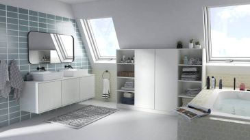 De beschikbare ruimte kan ook perfect worden veranderd in opbergruimte in badkamers met schuine daken. De twee kasten met schuine kanten links resp. achter bieden voldoende ruimte voor handdoeken, cosmetica, badjassen en nog veel meer. De witte inrichting geeft je kamer een zekere lichtheid.