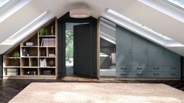 Symmetrie en vrijgevigheid karakteriseren deze twee kasten met een zijdelingse afschuining. In het decor wit hoogglans lenen de kasten de slaapkamer op de zolder zuivere elegantie en klasse. Ze verdelen het slaapgedeelte met millimeters precisie van het kleedgedeelte.