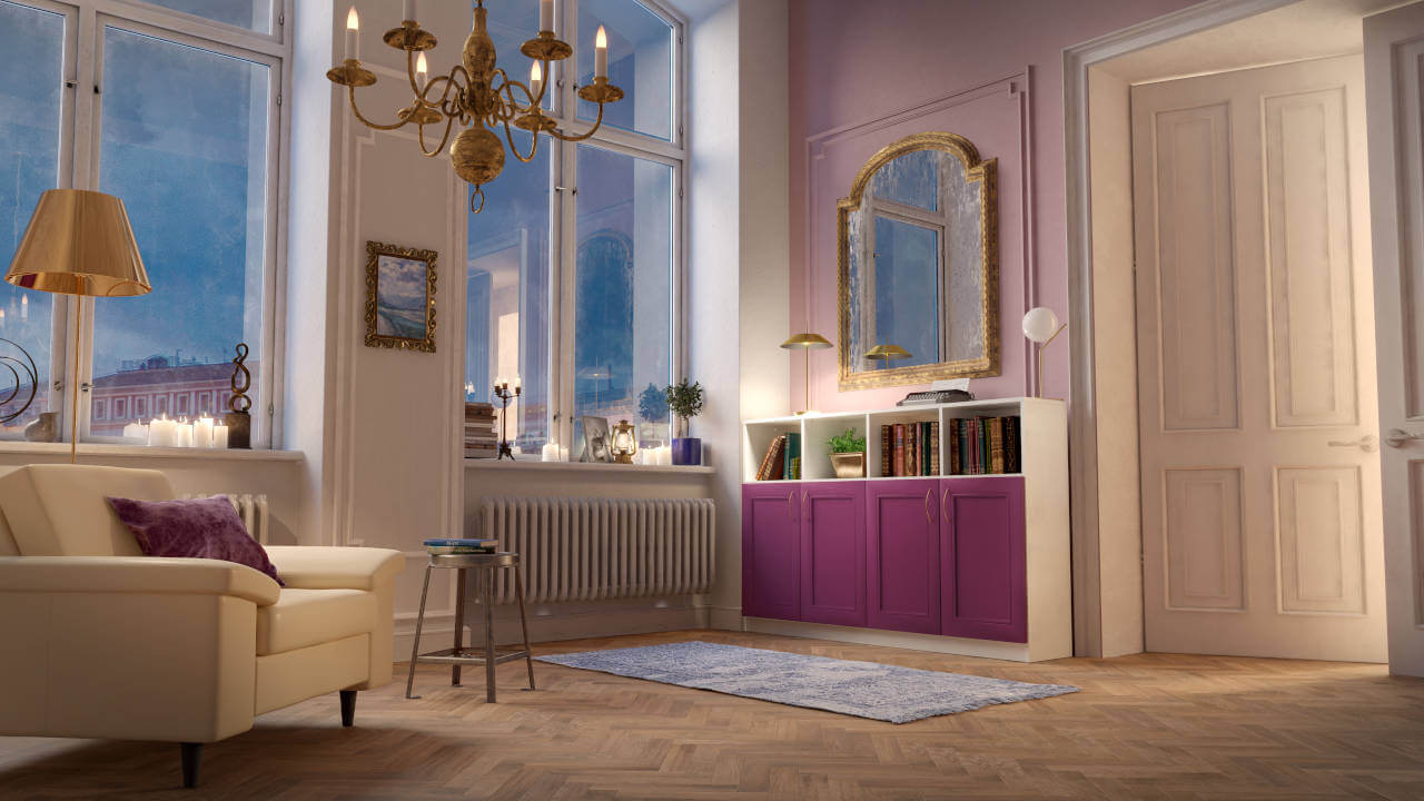 Configureer jouw woonkamerkast precies naar jouw wensen. Combineer een witte ombouw met fronten gelakt in een van ruim 190 RAL-kleuren, in mat of hoogglans. Hier: signaalviolet.