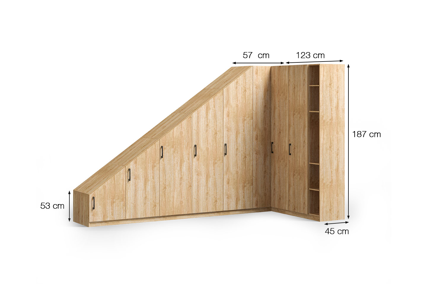 Het grootste voordeel van een inloopkledingkast voor een schuin dak is dat er ruimte wordt opgevuld, die voorheen onbruikbaar was. Daardoor wordt extra opbergruimte gecreëerd. Om ervoor te zorgen dat je inloopkast precies onder het schuine dak past, is het belangrijk dat de maten exact worden opgemeten. Dit kun je voor een kleine vergoeding laten doen door een professional of je kunt dit zelf doen met behulp van de gedetailleerde opmeetinstructies.
