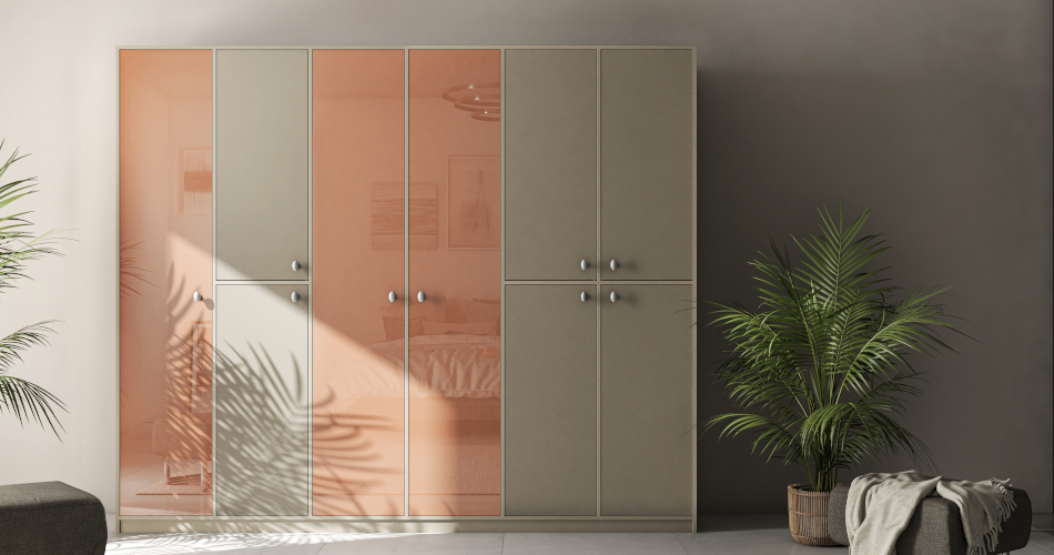De moderne garderobekast in de corpuskleur steengrijs krijgt door de inliggende deuren in de RAL-kleur beigerood een zeer individuele look.
